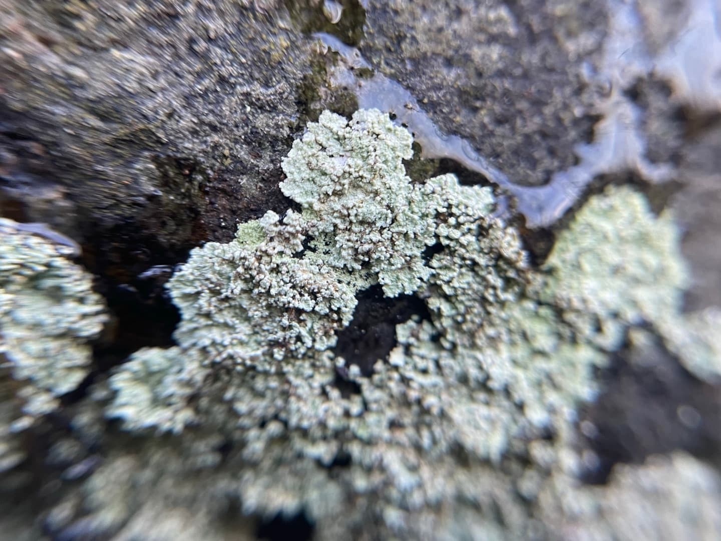岩に張り付くように広がる、このなんとも言えない色のこいつは、地衣類(ちいるい)と呼ばれる生命体。